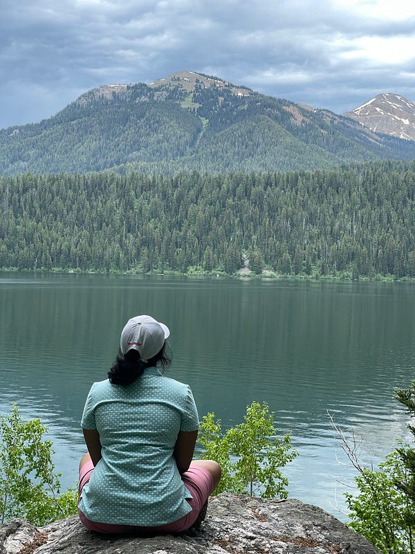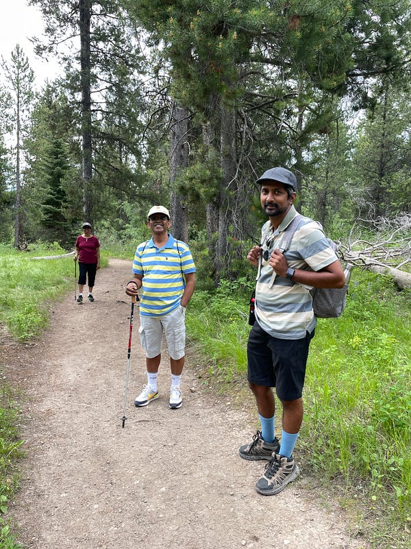 We had a slow-ish start to our morning — we checked out of our Airbnb and drove to the Rockefeller Preserve area for the 7-mile-long Phelps lake loop trail. We started the hike around 11 am and finished around 3 pm with several breaks in between. We also saw a couple of bears along the trail — one was about 10 feet away from us, and another at a considerable distance. Our initial plan for our long hike was the Surprise, Amphitheatre and Delta Lakes hike, however the Phelps lake loop was more appropriate for us considering the fact that our parents were with us, and they haven’t done strenuous hikes before.