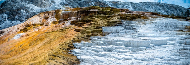We had an early-ish start today since we wanted to be at the Artists Point area in time for a spectacular sight. For a few minutes in mid-summer every year, the angle of the sun is just right to see this spectacular rainbow at the foot of the falls. We arrived just in time for this beauty! This is something you should absolutely not miss if you are in the area. We spent some more time looking at the upper falls, and the different views of the Grand Canyon of Yellowstone. Afterward, we made our way to the Mammoth Hot Springs Area. We walked on several of the boardwalk trails and looked at some incredible features and terraces formed by Calcium Carbonate deposits.
