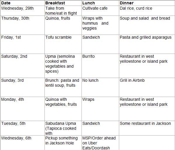 Food: Since our Airbnbs all had a fully stocked kitchen complete with pots/pans/utensils and even spices and oil, we planned our meals (a day-by-day chart is included below). We did deviate quite a bit from the chart, but by and large, this chart helped us out to a great extent with regard to deciding the supplies to take with us and picking produce up from local grocery stores.