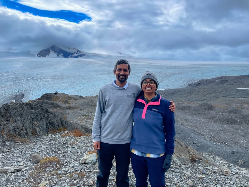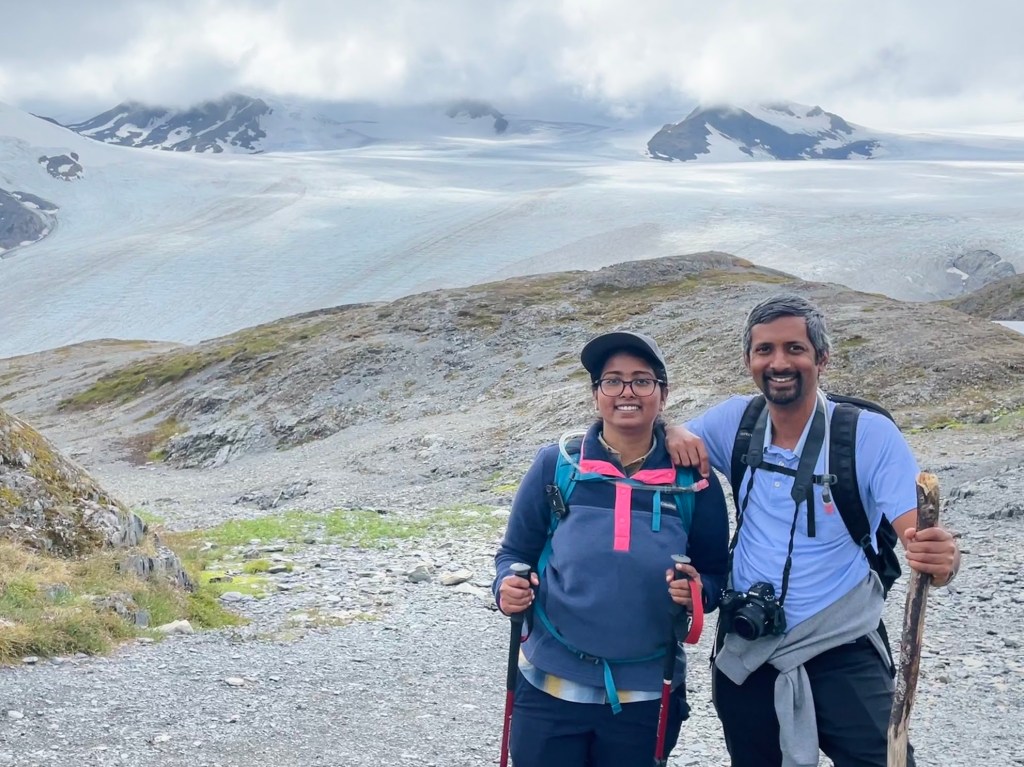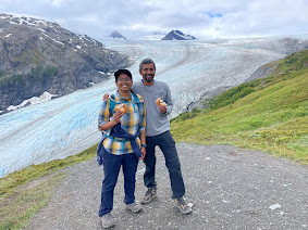 Day 7 – Harding Icefield Hike: From Anchorage, we drove to Seward for the Harding Icefield hike, which starts at the Exit Glacier visitor center. The staff there loaned us hiking poles, which came in handy. Initially, we planned to stop at the “Top of the Cliffs” viewpoint, since conditions beyond that were said to be uncertain. But the weather cleared up, so we pushed on all the way. The hike gains about 3,200 feet in 4 miles, making it tough, but the views of Harding Icefield and the sheer scale of it — the largest entirely within the U.S., feeding around 40 glaciers including Exit Glacier — made every step worthwhile. We ended the day with a dinner and spent the rest of the evening relaxing in our Airbnb.